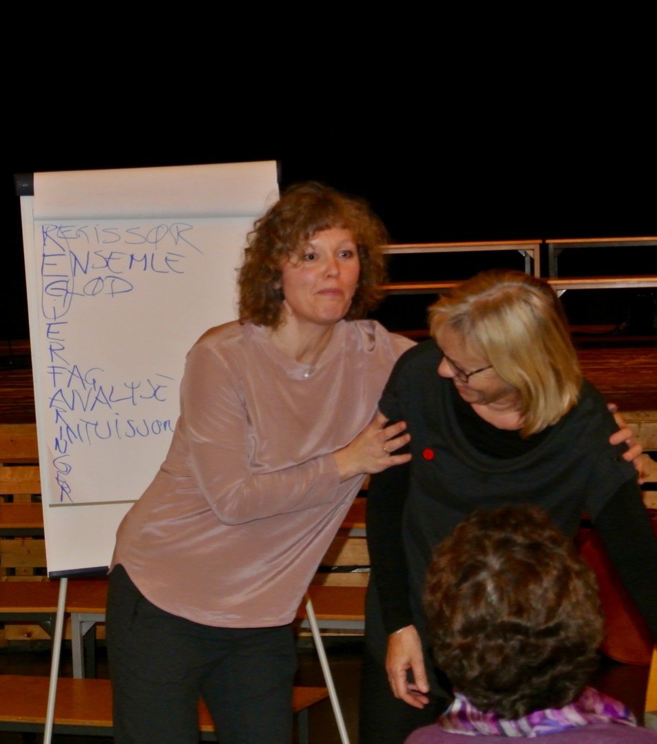 -En regissør skal utforme et kunstnerisk konsept for en forestilling som krever samarbeid mellom mange aktører. Det gjelder å analysere stykket, skape glød og engasjement hos hele ensemblet. En må skape trygghet hos skuespillerne, lar de bli kjent med hverandre gjennom lek. Så avbryter Kjersti seg selv, -det har gått 12 minutter. Da er det på tide å aktivisere publikum. Regissøren aktiviserer oss alle, som om vi er skuespillere, fin og humoristisk oppmyking. Hun går over til å filosofere, -holder Folkeakademiet kurs i pusteteknikk, det er vanlig i byen. Kjersti vektlegger å holde seg i form med turer i skogen.